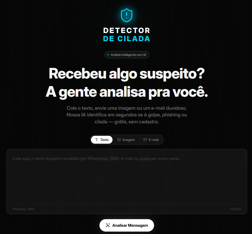 Criei o Detector de Cilada porque meus familiares — como minhas tias e minhas irmãs — sempre me mandam prints e links suspeitos com a mesma pergunta: