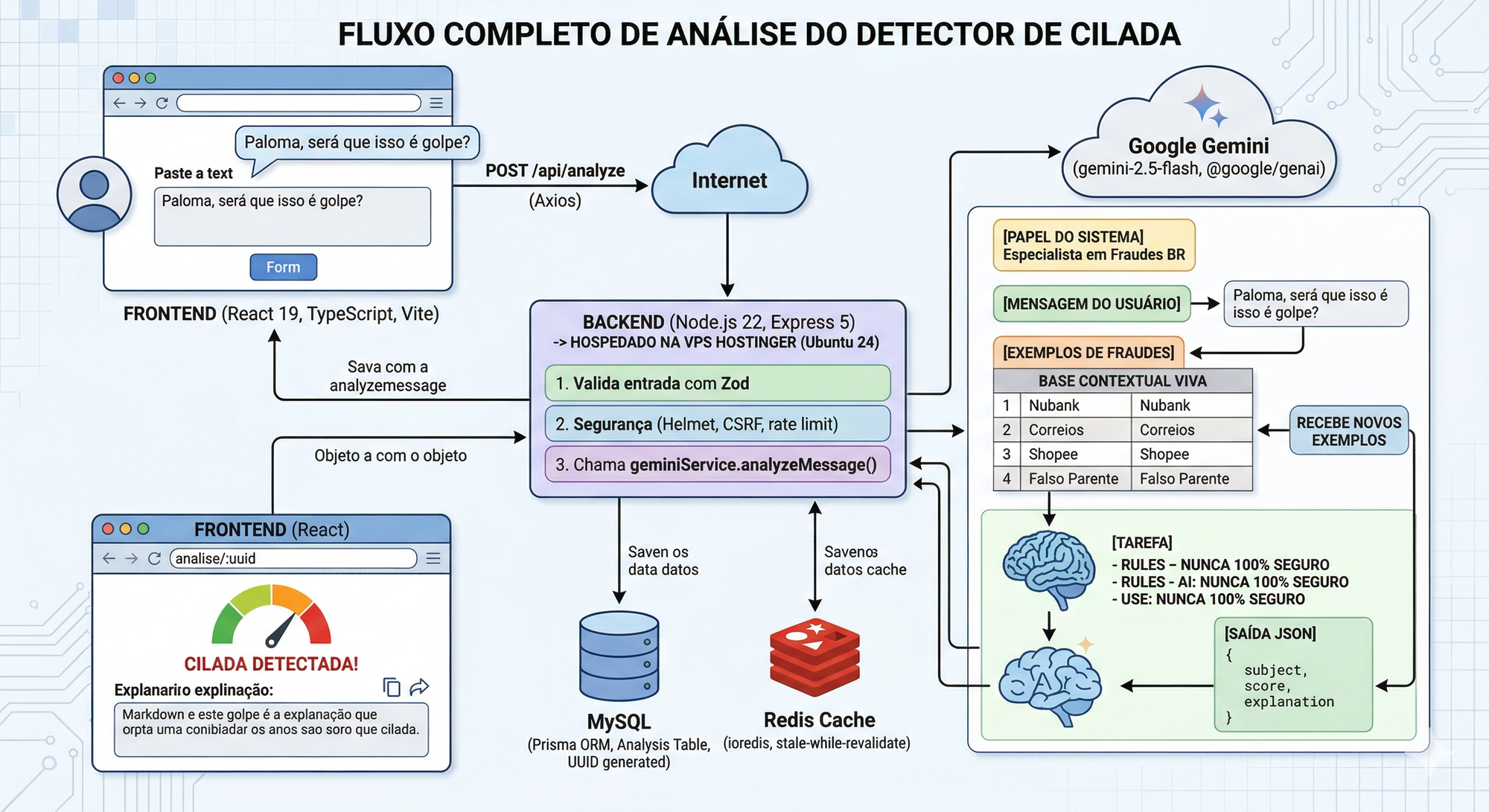 Conheça a arquitetura por trás do Detector de Cilada. Uma aplicação web construída com React, Node.js e Google Gemini AI para identificar fraudes online.